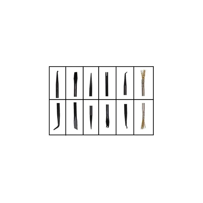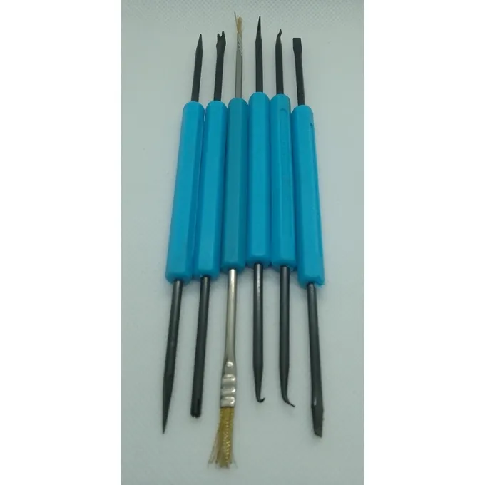 - É composto de 6 ferramentas que servem para limpeza de resíduos de solda, ampliação de furos de placa, remoção de componentes, corte de trilhas, auxílio no alinhamento de Ci´s SMD e também para auxiliar no reparo de câmeras digitais e smartphones, sendo portanto, indispensável sua utilidade em bancadas eletrônicas modernas e atualizadas.