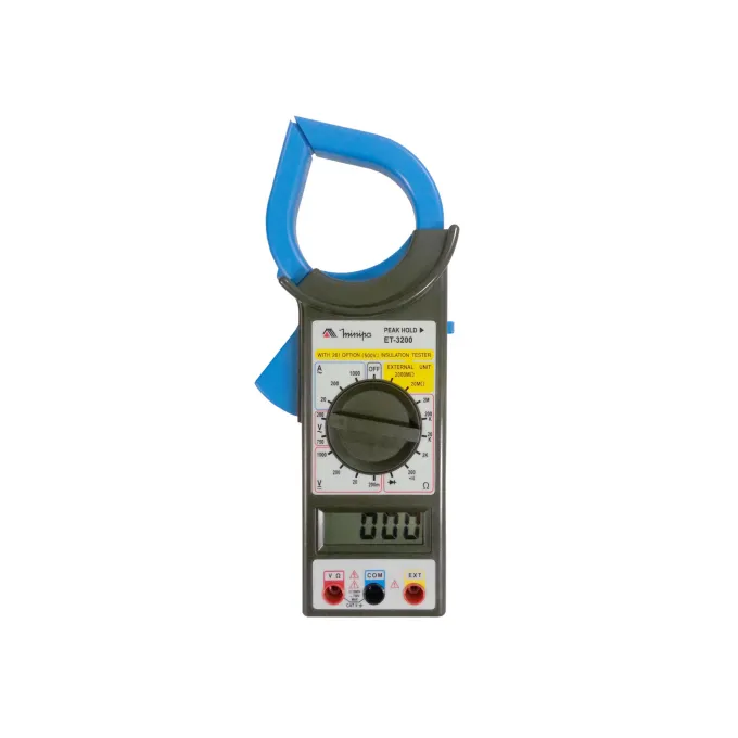 Instrumento digital portátil, melhor custo / benefício, de acordo com a categoria II de segurança, com função de congelamento de picos, LCD de 3 1/2 dígitos. Realiza medidas de tensão DC e AC, corrente AC até 1000A, resistência e testes de diodo e continuidade.