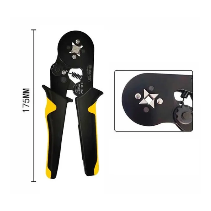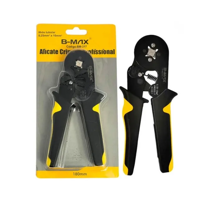 Alicate prensa terminais tipo pino tubular ajustável é indicado para prensar terminais tipo pino tubular, para fios e cabos com bitolas de 0,25 mm² a 10 mm². Possui acabamento pintado, proporcionando proteção contra corrosão/oxidação.