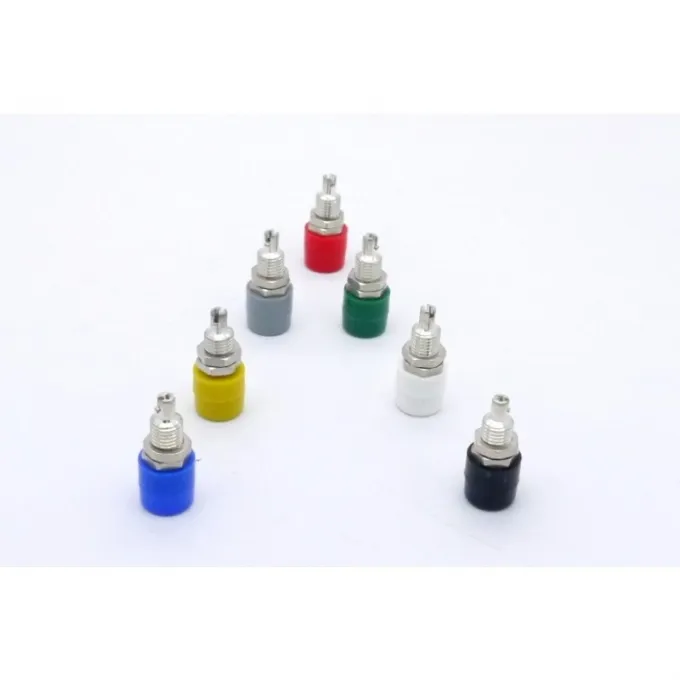 | Características: Borne: Ø 4 mm - Isolação em Polipropileno - Bucha em Latão - Acabamento Superficial Estanhado Especificações Técnicas: Resistência de Isolamento:> 100.000 M ohm a 500 Vcc 25 ºC 70 % U.R. Resistência de Contato Inicial máx.: 1m ohm Rigidez Dielétrica Típica: 2000 VRMS Corrente Nominal: 20 A Disponível nas Cores: PT - VM - VD - AM - AZ - BR - CZ |