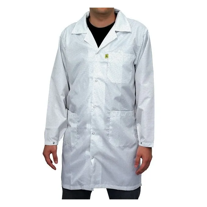 Jaleco antiestático. Confeccionados em tecido leve de poliéster e filamentos de nylon-carbono. Tecido possui resistividade superficial de 10* Ohms.