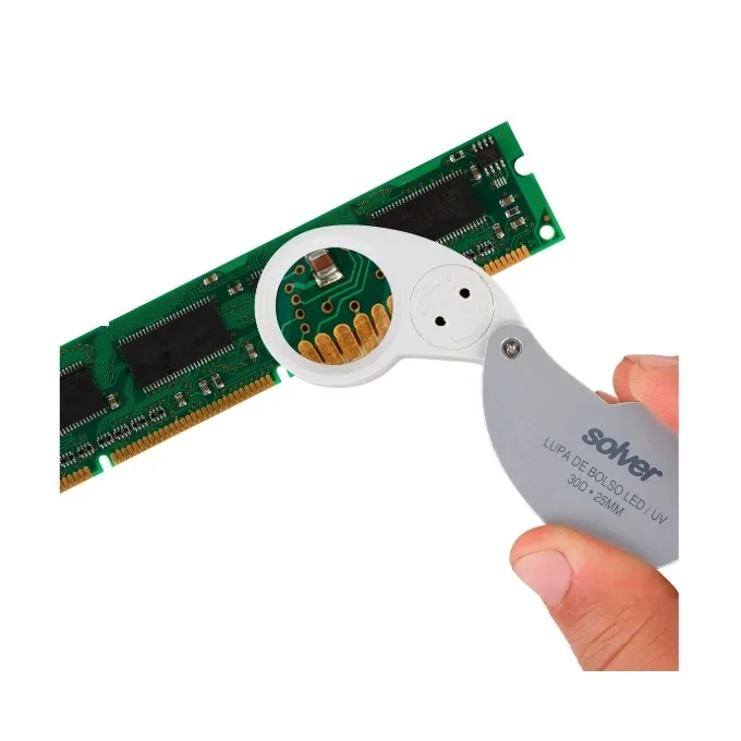 A Lupa de Bolso SLD-131 LED/UV é prática, compacta, leve e extremamente útil para qualquer profissional ou hobbista que deseja observar pequenos componentes ou objetos de forma detalhada. A lente de aumento de 30X e 25mm de diâmetro com iluminação LED branca e LED UV é perfeita para identificar os mínimos detalhes e a iluminação UV auxilia na identificação de marca d´água em notas de dinheiro. Indispensável para todas as demandas que exigem uma visão precisa, é uma ferramenta funcional que além de facilitar o trabalho, garantirá economia e desempenho em múltiplas aplicações. Ideal para reparos na área eletroeletrônica, controle de qualidade, indústria, microcomponentes, fornituras, relojoarias, joalherias, pesquisas laboratoriais, observação de mapas, colecionadores de moedas, selos, controle de pragas, análise de sementes, etc.