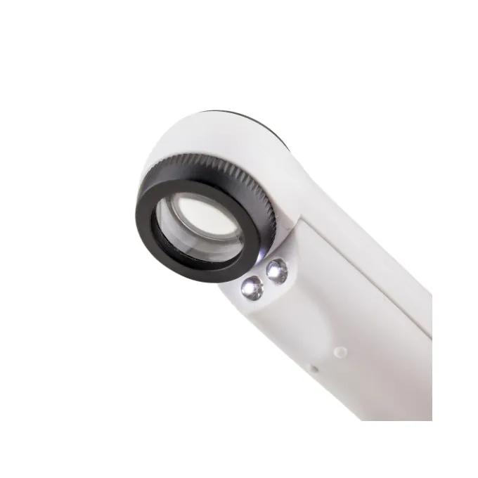 A lente de 21mm de diâmetro com aumento 40X, iluminação com 2 LEDs brancos é perfeita para ampliar, iluminar e proporcionar uma ampliação super detalhada para visualização nos mínimos detalhes em diversos procedimentos.
