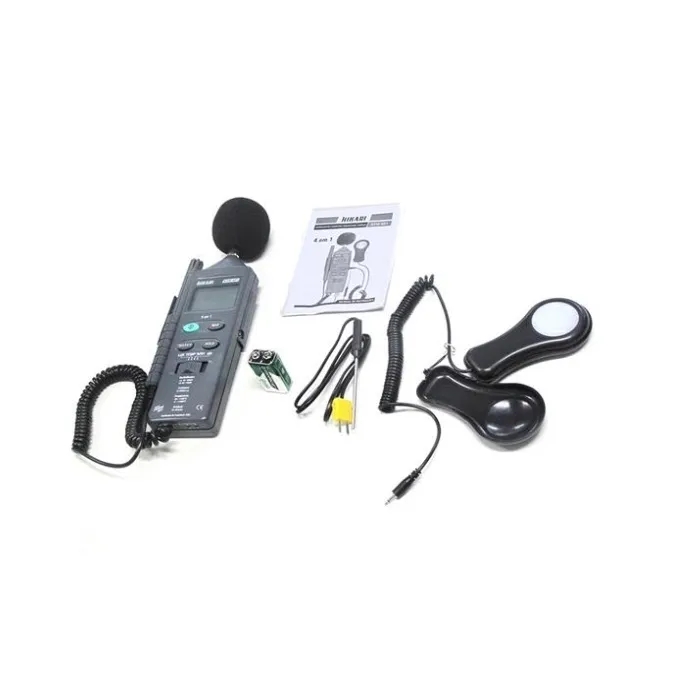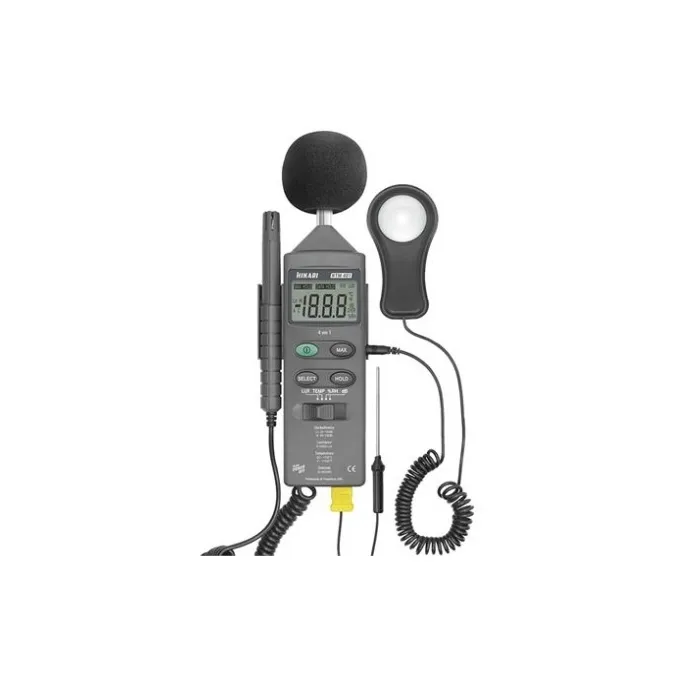 OTestadorMultifunçõesModeloHTM-401sedestacaporser4em1.Projetadoparacombinar as funções: Medidor de Luz (Luxímetro), Medidor de Som (Decibelímetro), Medidorde Umidade(Higrômetro)eMedidor deTemperatura(Termômetro).