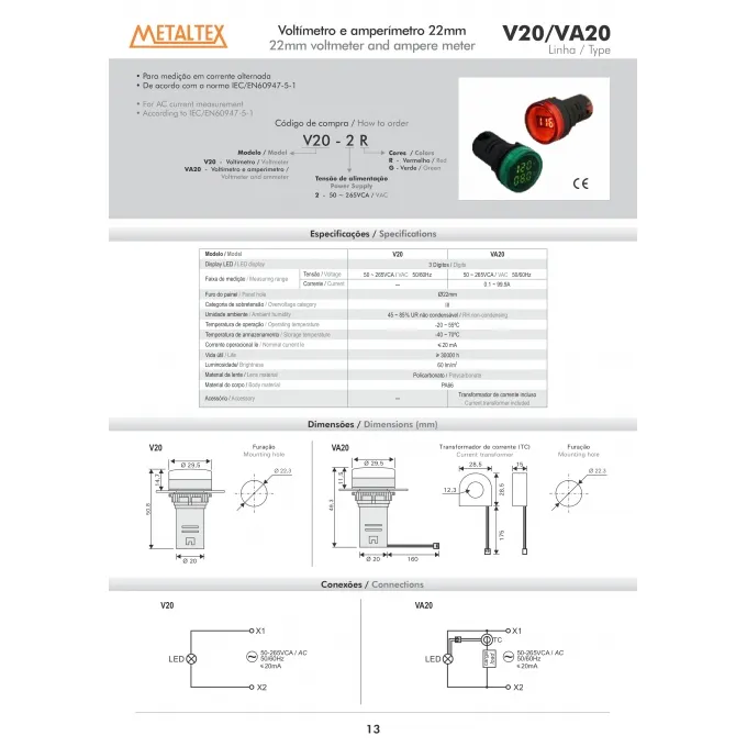 Mede tensões de 50 até 265VCA 50/60Hz.