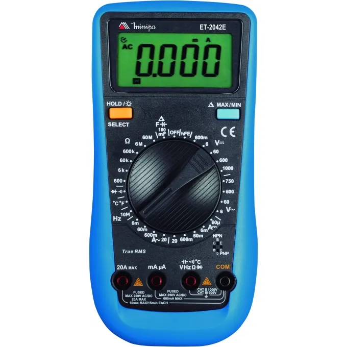Instrumento TRUE RMS projetado para profissionais que necessitam de uma ampla gama de funções podendo ser usado em laboratórios e ambientes de média potência desde que esteja de acordo com a sua categoria de segurança. Realiza medidas de tensão e corrente DC/AC, resistência, capacitância, frequência, temperatura, testes de diodo e continuidade e modo data hold.