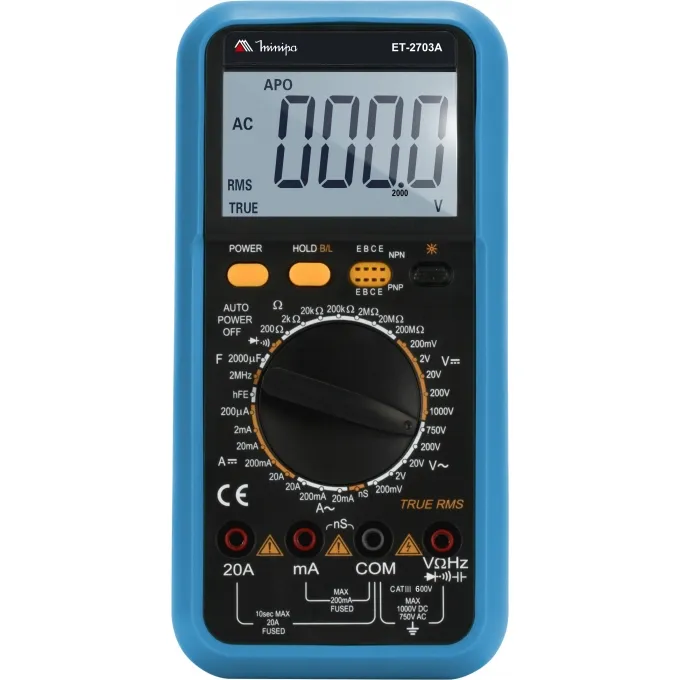 O multímetro digital Modelo ET-2703A é um instrumento com display de 20000 contagens, possui mudança de faixa manual, tensão DC e AC, corrente DC e AC, True RMS, frequência, capacitância, resistência, teste de diodo, hFE de transistor e continuidade. Foi projetado para uso em laboratório, em casa, e por hobistas e entusiastas na área elétrica, eletrônica e informática. Como características adicionais apresenta as funções Auto Power Off e indicador de bateria fraca.