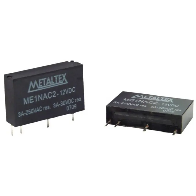 Relé eletromecânico de perfil estreito (5mm) selado com 1 contato NA com capacidade de 3A. Tensões disponíveis de bobina de 12 e 24VCC. Dimensões 17,5 x 5,08 x 12,5mm. Terminais CI. Soquete para PCI disponível