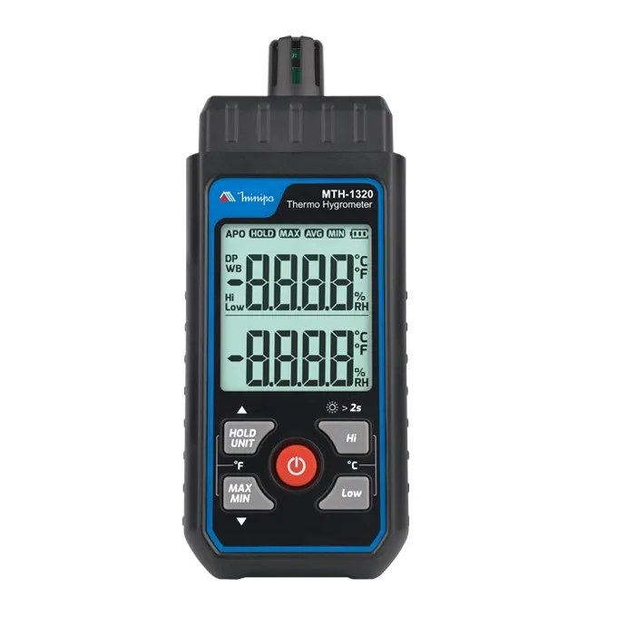 O MTH-1320 um termo-higrômetro de alta precisão, oferece facilidade de uso e diversas funcionalidades essenciais para medição de temperatura e umidade. Inclui funções como data hold, medição máxima/mínima/média, desligamento automático com opção de cancelamento, configuração de limites de alarme Hi-Low, luz de fundo e alarme de luz colorida para leitura em ambientes com pouca iluminação, e indicação de bateria baixa para garantir confiabilidade nas medições.