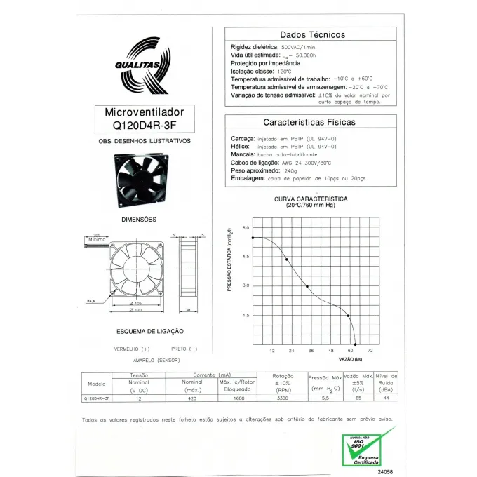 As especificações elétricas e aerodinâmicas do Mini Ventilador DC Q120D4R-3F respeitam normas aplicáveis e suas dimensões obedecem padronização dos fabricantes, sendo perfeitamente intercambiáveis com aparelhos similares.