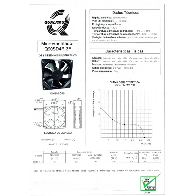 As especificações elétricas e aerodinâmicas do Mini ventilador DC Q90SD4R-3F respeitam normas aplicáveis e suas dimensões obedecem padronização dos fabricantes, sendo perfeitamente intercambiáveis com aparelhos similares.